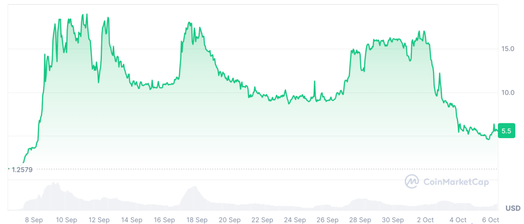 MYX is priced around $5.45, up by 9.4% in 24 hours. Turnover remains high after a rapid multi-week climb. Price action is volatile because of an airdrop dispute that surfaced in September.