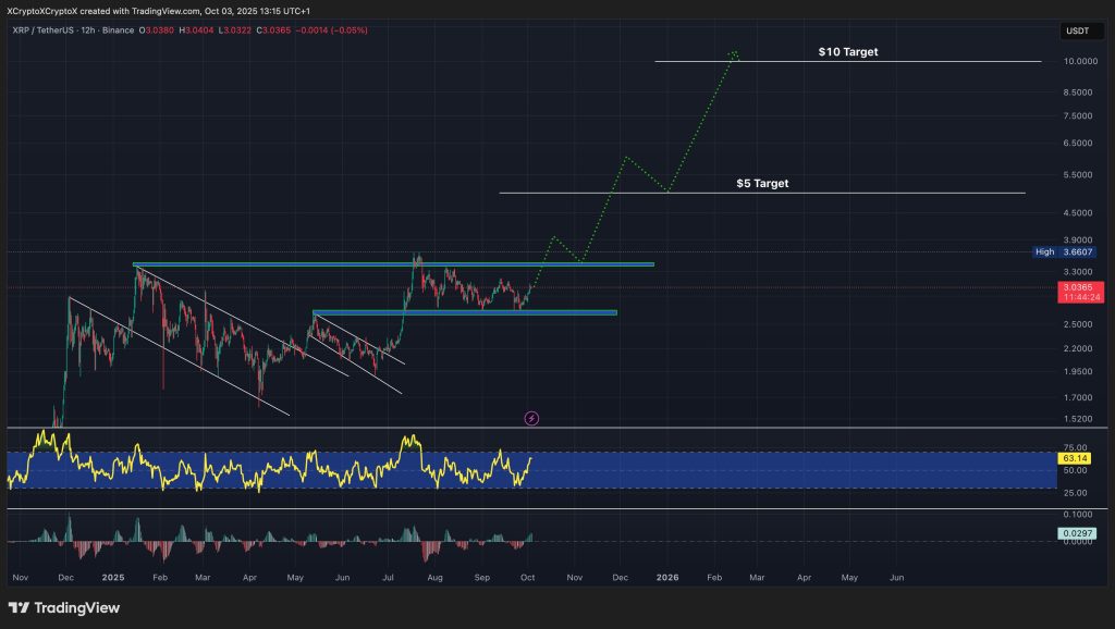 Over the past year, XRP has gained 492%, far outperforming Bitcoin’s 98% rise. After a summer breakout, the coin consolidated near $3 before its typical September correction.