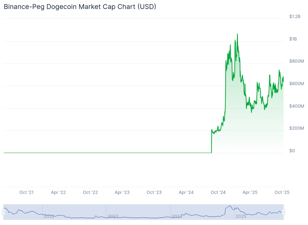 Binance-Peg Dogecoin is the DOGE of Binance – each token pegged 1:1 to the real DOGE. Though it’s been around since 2021, it only truly grabbed the meme coin spotlight in late August, overtaking Baby Doge as the top dog-themed token on BNB Chain.