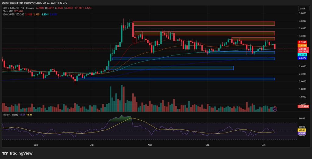 Moving averages reveal a key bearish breakdown, with XRP now trading below key EMAs: the 20-day at $2.9338 (+2.4%), the 50-day at $2.9331 (+2.4%), while testing the key 100-day at $2.8541 (-0.3%).