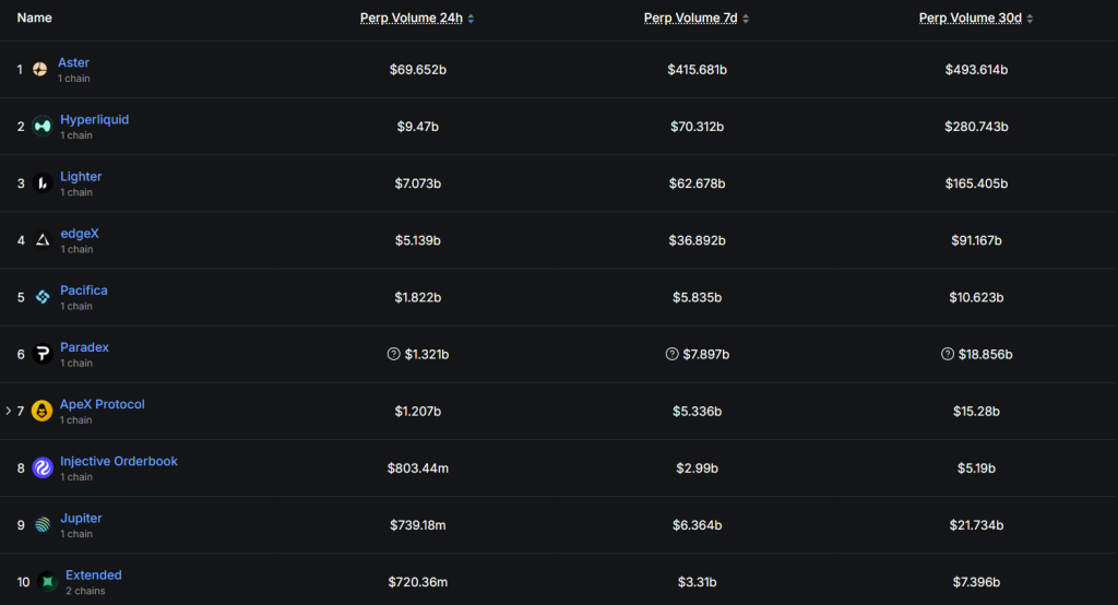 The fast-rising Aster DEX recorded the highest volume over the last 30 days, accumulating $493.61 billion, nearly 50% of the entire perp DEX market share.