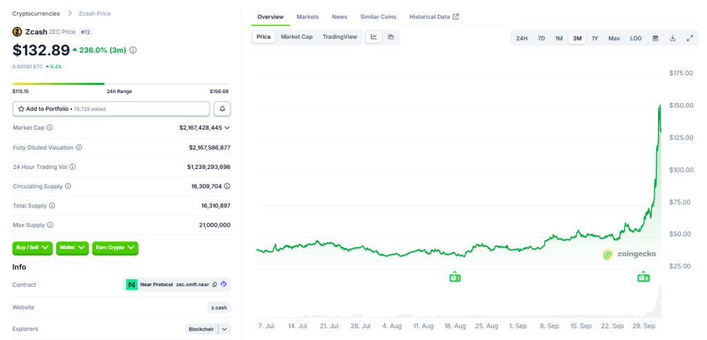 Zcash (ZEC) has more than doubled in price in the past week, as demand for privacy coins climbs during the broader “Uptober” rally. The coin jumped from around $50 to over $130 on October 3, reaching $135.54 at its peak, according to CoinGecko.